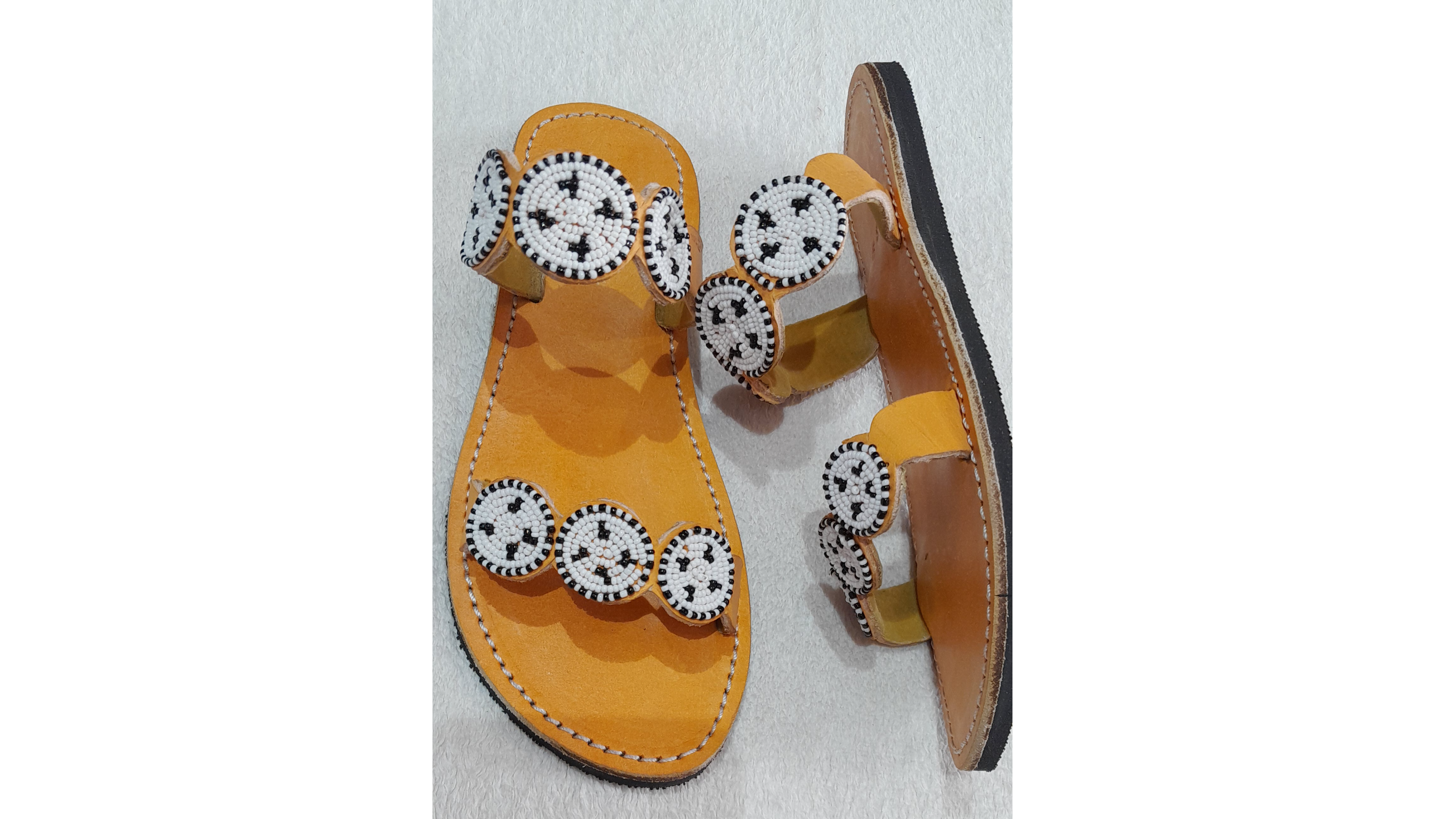 This pair is done on pure leather materials , strand beads and the sole is rubber, they will last you years after purchase. we make them on order, customized to your fitting whether wide/slender or normal fitting.